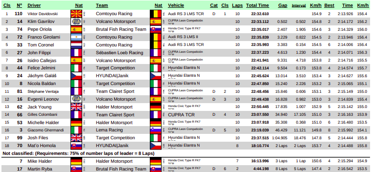 Tras pasar la segunda fecha del campeonato sigue como líder con 133 puntos, seguido por Coronel a 120 y Klim Gavrilov con 109 unidades. La próxima fecha del TCR Europe será en Spa Francorchamps el fin de semana del 17 al 19 de junio.