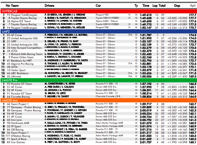 En el segundo puesto ha tenido en el FP1 a su prototipo hermano, el No.94 con Duval, Menezes y Müller a +877 décimas de 1:51.413. Mientras que el top tres se cerró con Toyota Gazoo Racing No.7 de Pechito López y Kobayashi y Conway tras marcar 1:51.675.