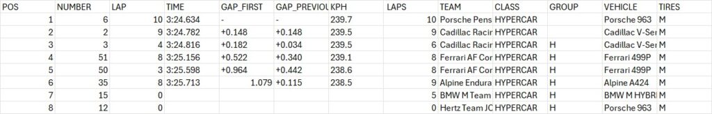 Los sietes que completaron el clasificador fueron las Ferrari AF Corse N°51 (Pier Guidi-Calado-Giovinazzi), Ferrari AF Corse N°50 (Fuoco-Molina-Nielsen), Alpine Endurance Team N°35 (Chatin-Habsburg-Milesi) y BMW M Team WRT (Vanthoor-Marciello-Wittmann). Cabe destacar que Hertz Team JOTA N°12 de Stevens, Nato y Ilott no lograron hacer tiempo por no llegar a reparar el vehículo.