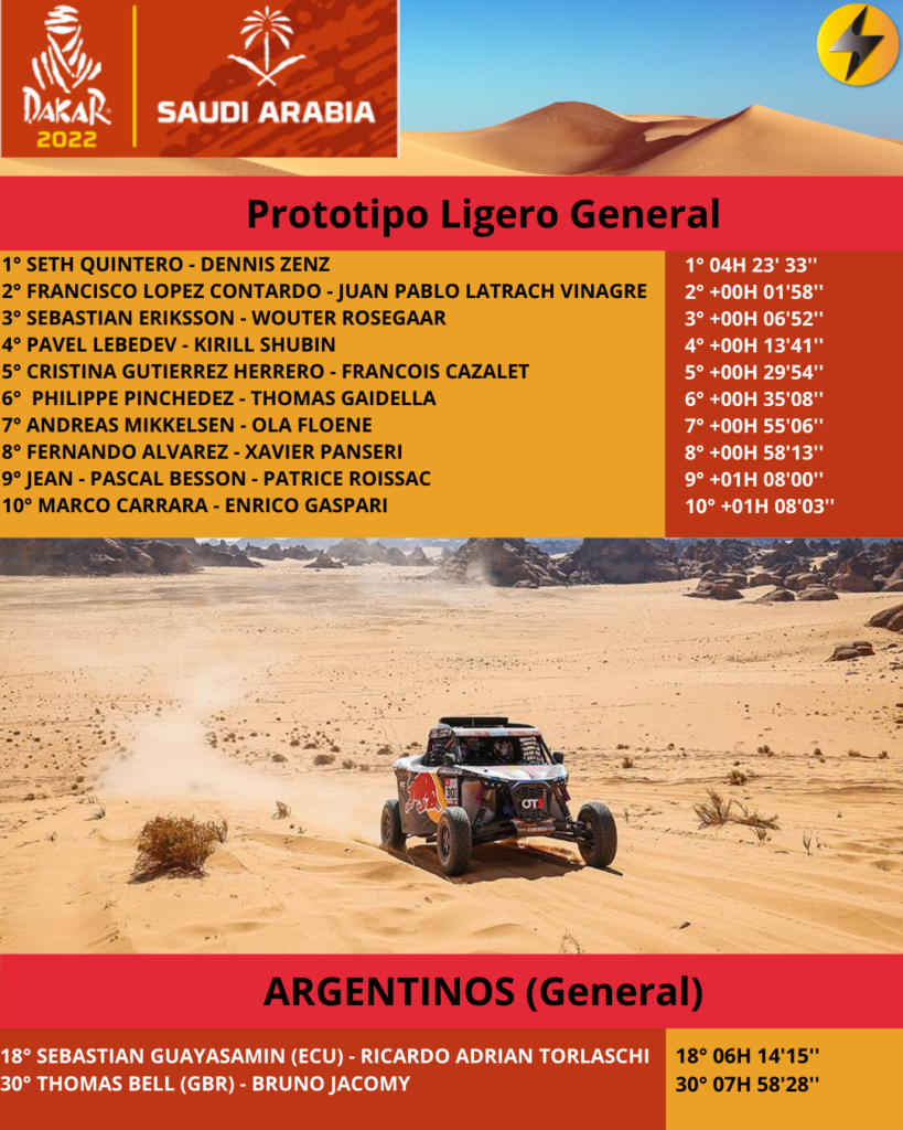 Por los prototipos ligeros Seth Quintero se quedó con la victoria, mientras que para los Side By Side tuvo a Aron Domzala en la primera etapa oficial del Rally Dakar.