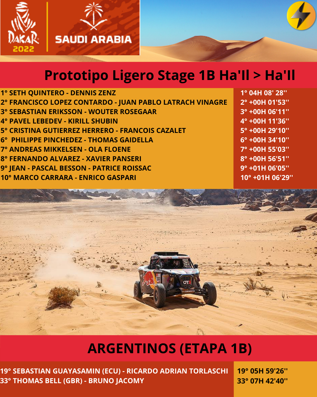 Por los prototipos ligeros Seth Quintero se quedó con la victoria, mientras que para los Side By Side tuvo a Aron Domzala en la primera etapa oficial del Rally Dakar.
