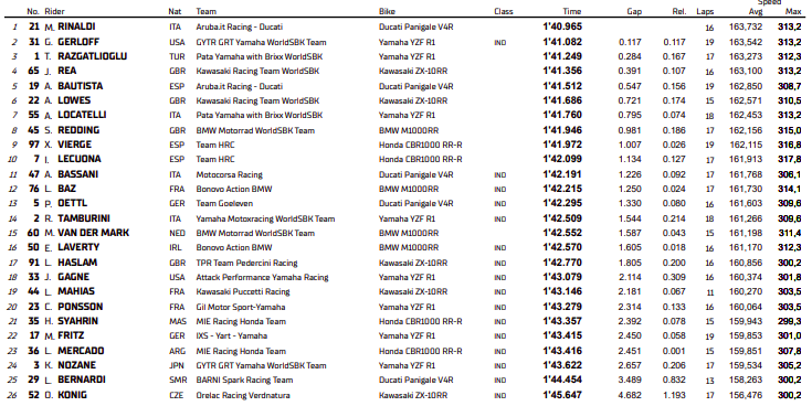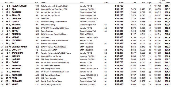 En el segundo lugar tuvo al corredor estadounidense, Garrett Gerloff que quedó con 1:41.082. Ya completando el clasificador de los tres mejores el campeón, Toprak Razgatlioglu a +284 décimas.