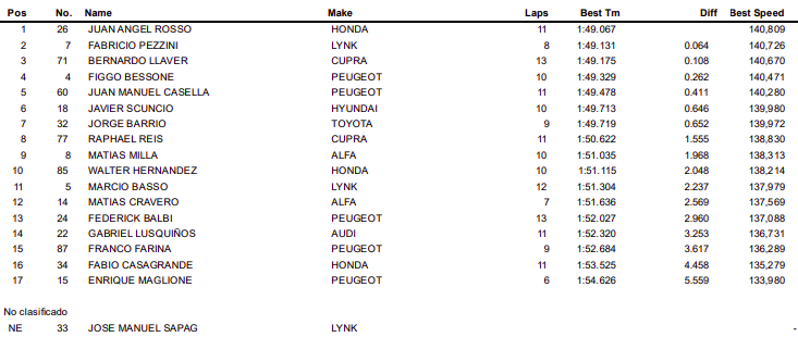 El clasificador de los cincos mejores fueron clasificados con Figgo Bessone, que esta debutando con un Peugeot del PMO Racing quedó cuarto. Quinto finalizó por su lado Juan Manuel Casella con 1:49.478.