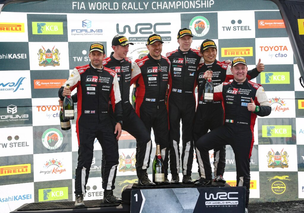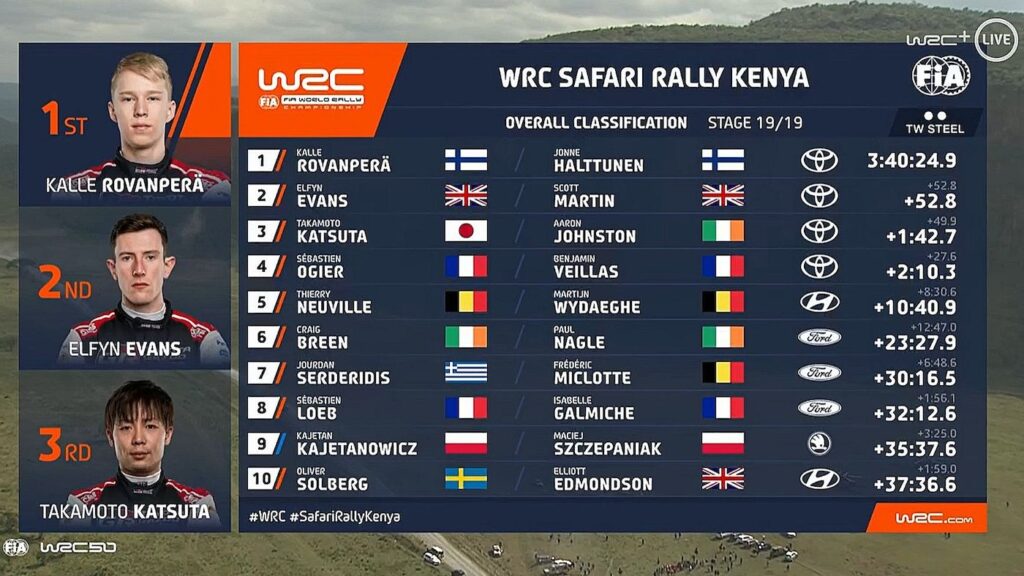 El japones Takamoto Katsuta junto a Johnston logró culminar en el tercer puesto a más de una hora con 42 minutos y 7 segundos. Tras hacer esto el equipo Toyota Gazoo Racing cerró el Rally de Kenya con el 1-2-3.