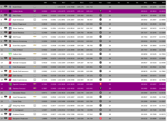 El clasificador de los diez mejores quedó con Rinus Veekay, David Malukas, Will Power, Marcus Armstrong y en el décimo puesto quedó Scott McLaughlin del equipo Penske.