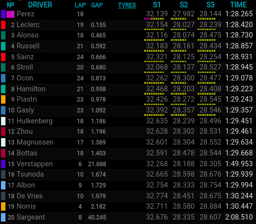 Lando Norris por su lado ha tenido un problema grande con la suspensión. Tras haber tenido un toque contra un muro debió abandonar y finalizó 19°. Mientras tanto Williams no ha encontrado ritmo y ha caído en el clasificador con 17° y 19°.