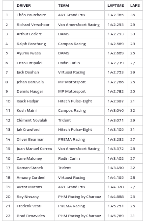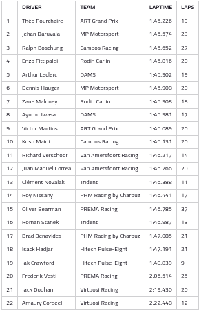 El clasificador de los diez mejores quedó con Enzo Fittipaldi, Arthur Leclerc, Dennis Hauger, Zane Maloney, Ayumu Iwasa, Víctor Martín y décimo Kush Maini.