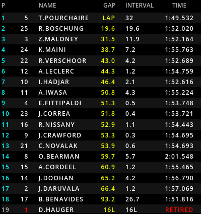 Al reanudar la competencia Théo lograba sacar una mínima brecha sobre Ralph Boschung, seguido de que en la lucha del séptimo lugar tuvo a Enzo Fittipaldi pasando a Zane Maloney. En el quinto giro por su lado estaba el cuarto abandono de carrera con Hauger que debía ingresar a boxes por roturas.