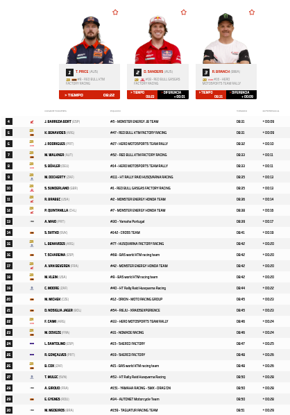 Los cincos mejores del clasificador cerraron con el Español de Monster Energy JB Team, Joan Barreda Bort a nueve segundos de Toby Price. El quinto por su lado fue Kevin Benavides con la moto de Red Bull KTM Factory con 08:31.
