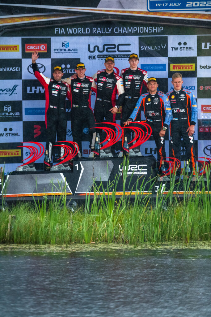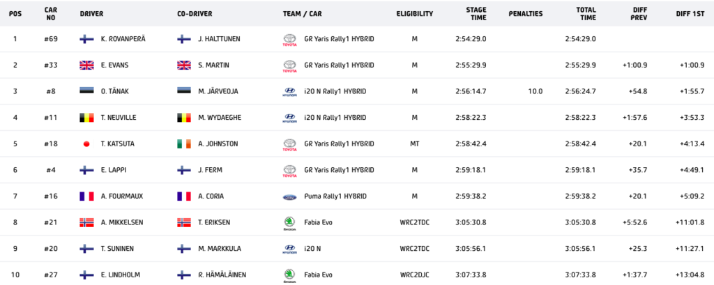 Desde el segundo tuvo Elfyn Evans, el compañero de Rovanperä, que tuvo al principio dominando pero por la lluvia del viernes perdió varios minutos sobre su rival directo. Al final quedó a +1:00.9 del ganador. Y cerrando el top tres de la prueba con Ott Tanak, el local de esta cita no pudo pelear a los Toyota y se conformó con el 3er lugar.