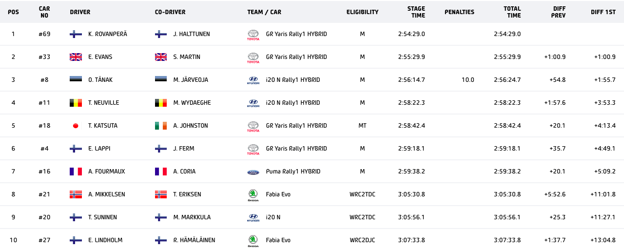 Desde el segundo tuvo Elfyn Evans, el compañero de Rovanperä, que tuvo al principio dominando pero por la lluvia del viernes perdió varios minutos sobre su rival directo. Al final quedó a +1:00.9 del ganador. Y cerrando el top tres de la prueba con Ott Tanak, el local de esta cita no pudo pelear a los Toyota y se conformó con el 3er lugar.