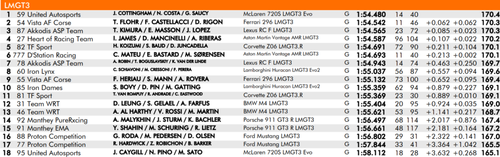 Akkodis ASP Team con el Lexus RC F LMGT3 N°87 con el cordobés José María «Pechito» López junto a Takeshi Kimura con Esteban Masson quedaron con 1:54.565. El mejor giro fue del francés Masson.