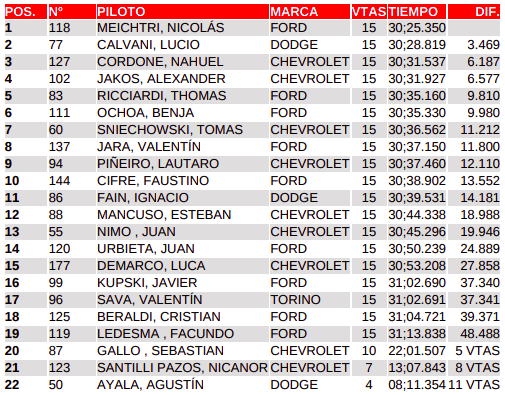 El tercer lugar tuvo a Nahuel Cordone que pudo aprovechar para avanzar tras el fuerte accidente que tuvo Nicanor Santilli Pazos y Sebastian Gallo que tuvo problemas. Santilli Pazos perdió el control y se fue a los neumáticos que contenían, pero por suerte salió sin lesión.