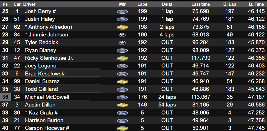 William Byron con el Camaro de Hendrick Motorsport pudo soportar la ayuda de su compañero de equipo, hablamos de Alex Bowman. Que logró darle el último empujón para separarse de sus principales rivales. Además de que atrás ha tenido un nuevo accidente ocasionado por Corey LaJoie y Ross Chastain, quién fuera el último líder de la carrera.
