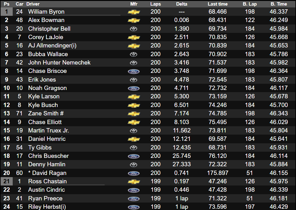 Con tan solo 26 años, Byron obtuvo su primer gran triunfo en las míticas 500 Millas de Daytona. Mientras que el top tres quedó en manos de Alex Bowman y Christopher Bell.